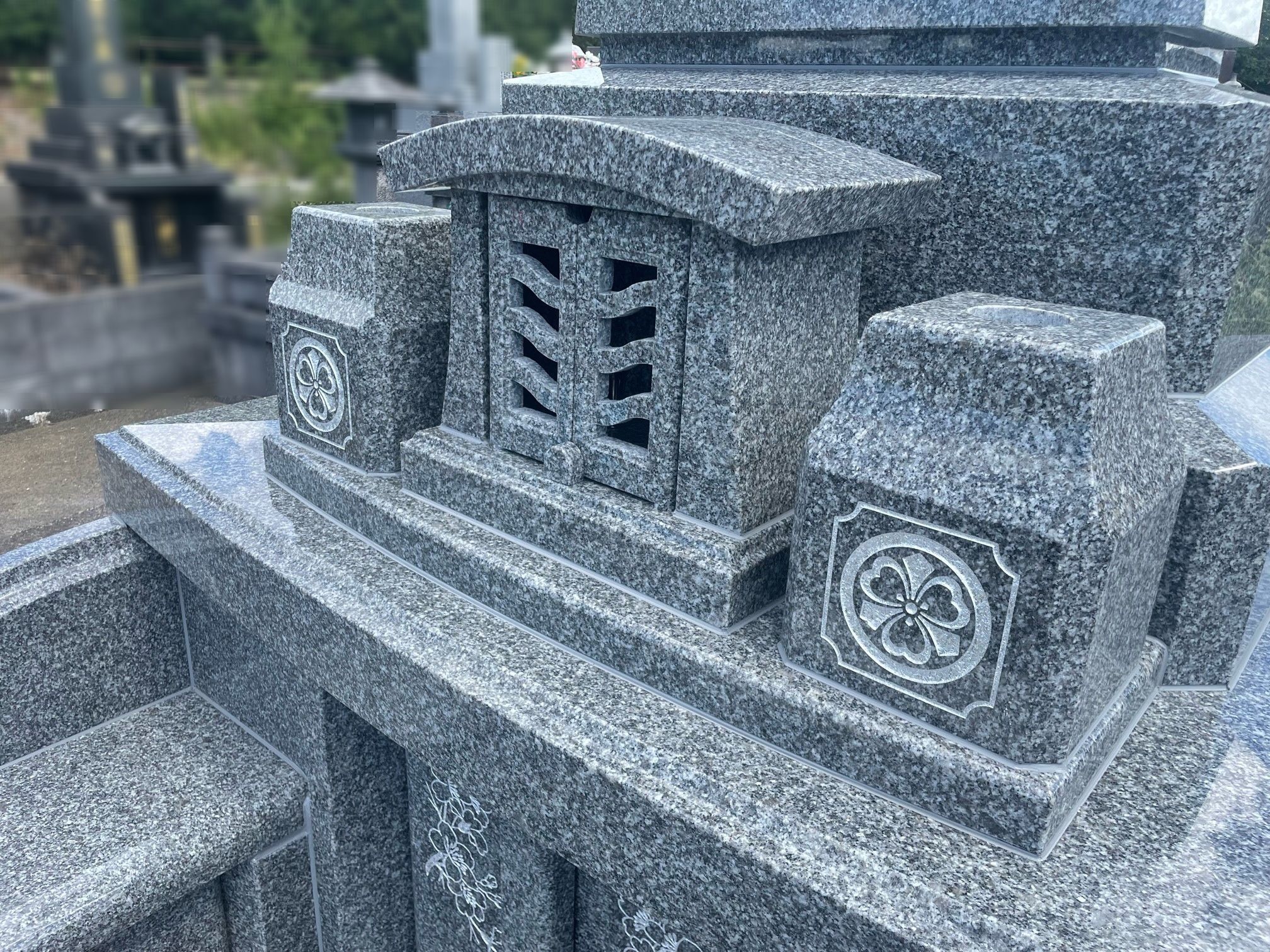花立と線香部分です。見本の中からお墓に一番マッチするこの形をご提案させて頂きました。花立部分には、家紋を彫刻しこちらもプラチナ色の箔にて着色してます。2家族連名のお墓でしたが、家紋は同様でしたので、こちらに直国となりました。