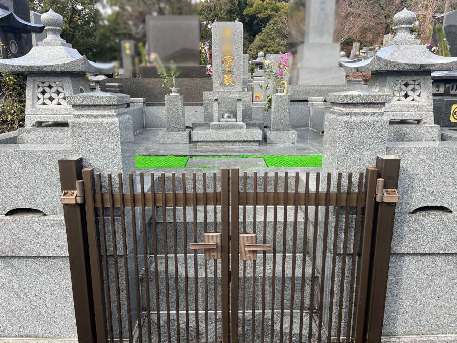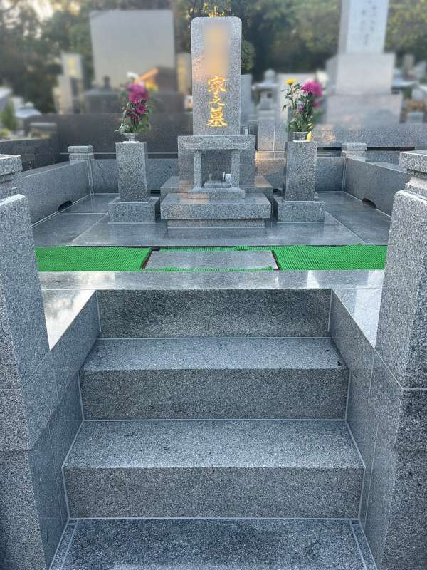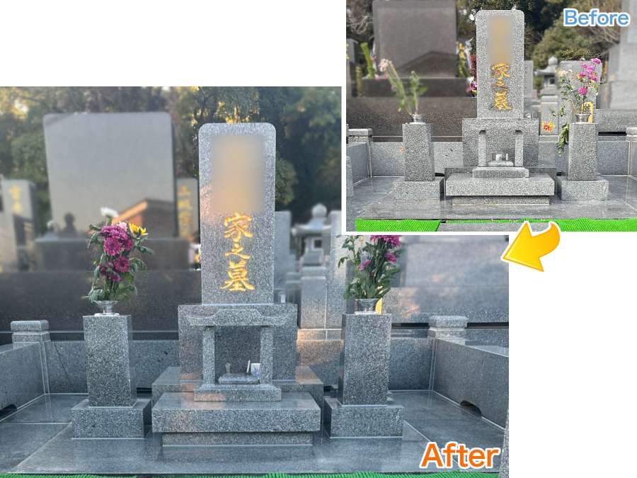 土間の石貼りもきれいにクリーニングをして、目地を打ち直しました。できる限り汚れがつきにくいようコーティングも施工し、離れていても安心していただけるお墓になりました。