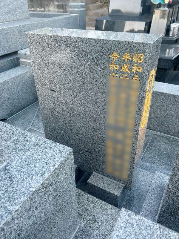 とてもきれいにお掃除をされていて、大切にお参りされている印象のお墓でした。ただ全体的によく確認をすると、おっしゃるようにお墓本体や外柵に水垢などが見られました。そのほかにも、経年で金箔が剥がれていたり、セメント目地が取れてしまっていたりといったところも見られました。お客様とお話しし、金箔の入れ直しや目地コーキングの手直しなどの補修もあわせてさせていただくことになりました。