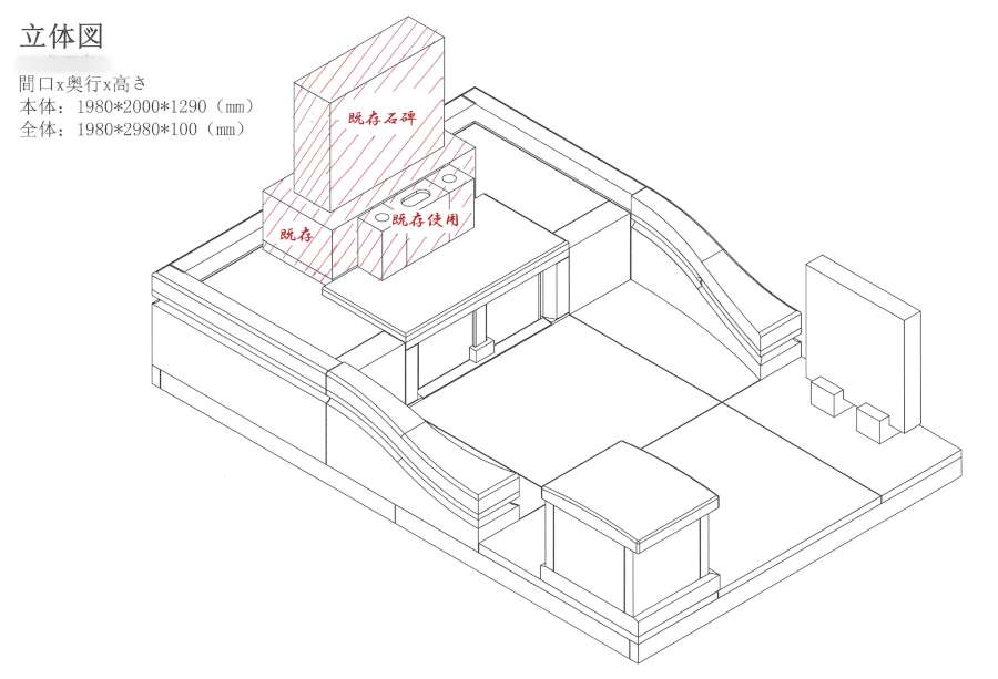 ご提案図面です。展示場のお墓や施工事例などをご覧いただいてご希望を伺うと、「掃除しやすいこと」「収納をつけたいこと」などご要望が明確になっていきました。赤い斜線部が既存の石を使用している箇所で、お墓本体の石碑、花立と水鉢です。納骨室や外柵、墓誌は新たに作成します。入り口左手にはご希望の収納庫を設置しています。こちらでご納得いただき、工事をお任せいただきました。