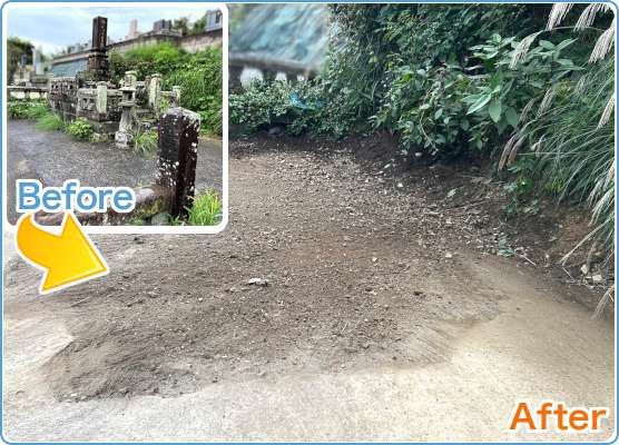 ご事情でお墓を守っていくのが難しくなり、お墓じまいをご希望でした。まずは雑草に覆われた墓地の草を刈って魂抜きやご遺骨の取り出しをお手伝いし、墓石の解体・撤去、防草シートを貼って仕上げました。改葬許可手続きのお手伝いも当社でさせていただきました。