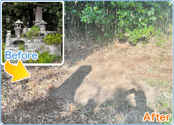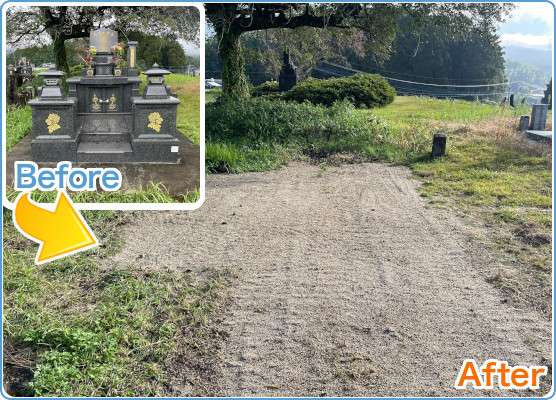 ご事情でお墓を守っていくのが難しくなり、お墓じまいをご希望でした。まずは雑草に覆われた墓地の草を刈って魂抜きやご遺骨の取り出しをお手伝いし、墓石の解体・撤去、防草シートを貼って仕上げました。改葬許可手続きのお手伝いも当社でさせていただきました。